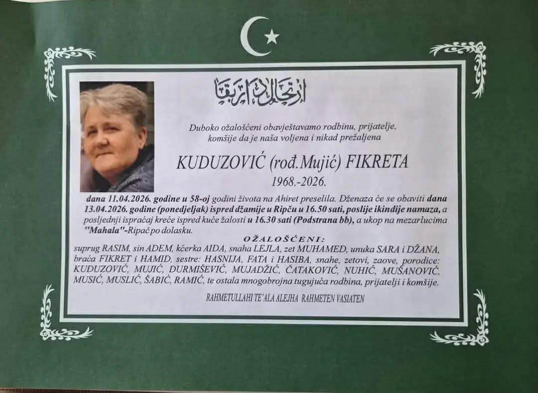 dana 11.04.2026. godine u 58-oj godini života na Ahiret preselila. Dženaza će se obaviti dana 13.04.2026. godine (ponedjeljak) ispred džamije u Ripču u 16.50 sati, poslije ikindije namaza, a posljednji ispraćaj kreće ispred kuće žalosti u 16.30 sati (Podstrana bb), a ukop na mezarlucima “Mahala” – Ripač po dolasku.