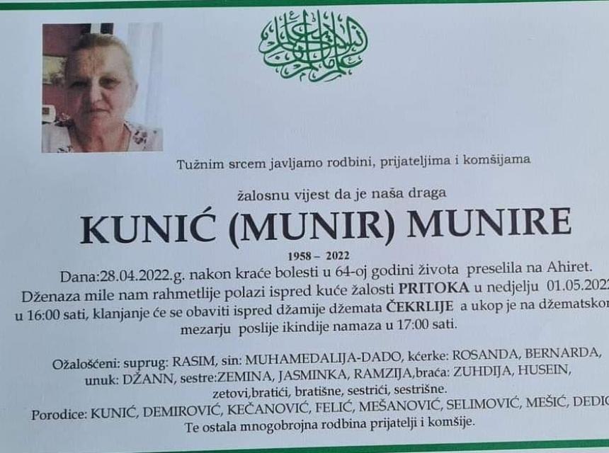Tužnog srca i s bolom u duši obavještavamo rodbinu, komšije i prijatelje da je naša draga Kunić (Munir) Munire u 64. godini života preselila na Ahiret.