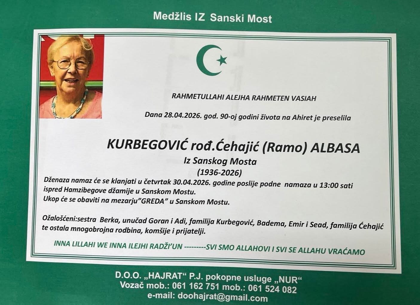 Dženaza-namaz će se klanjati u četvrtak 30.04.2026. godine poslije podne-namaza u 13:00 sati ispred Hamzibegove džamije u Sanskom Mostu.