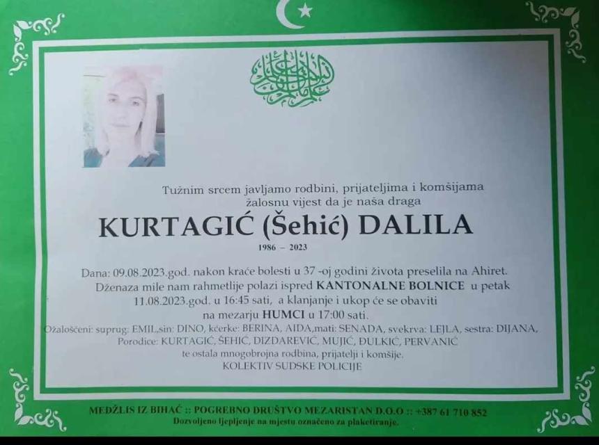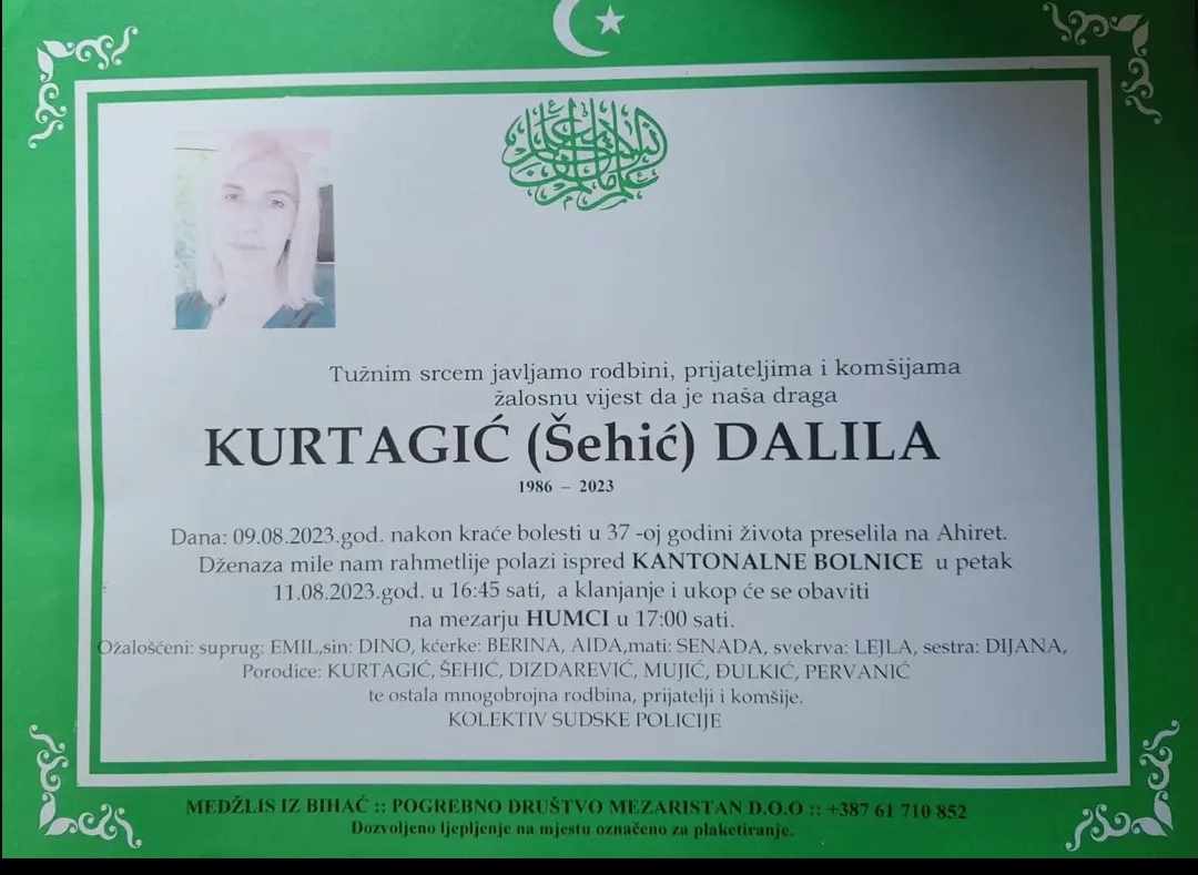 Tužnim srcem i bolom u duši javljamo rodbini, prijateljima i poznanicima da je naša draga Kurtagić (Šehić) Dalila dana 09.08.2023. godine u 37-oj godini života preselila na Ahiret.