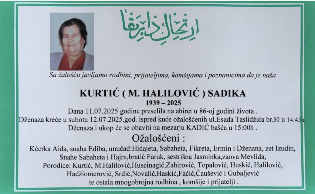Dženaza kreće u subotu 12.07.2025. ispred kuće ožalošćenih ul. Esada Taidžića br. 30 u 14:45 sati.