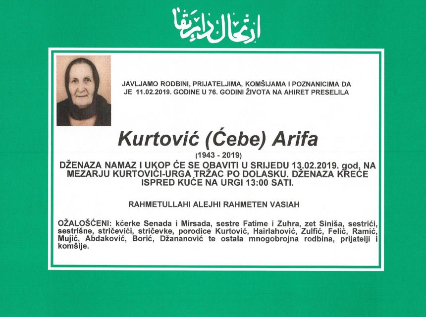 Javljamo rodbini, prijateljima,komšijama i poznanicima da je 11.02.2019. godine u 76. godini života na Ahiret preselila Kurtović (Ćebe) Arifa. Dženaza namaz i ukop će se obaviti u srijedu 13.02.2019. godine na mezarju Kurtovići-Urga, tržac po dolasku. Dženaza kreće ispred kuće na Urgi u 13:00 sati.
