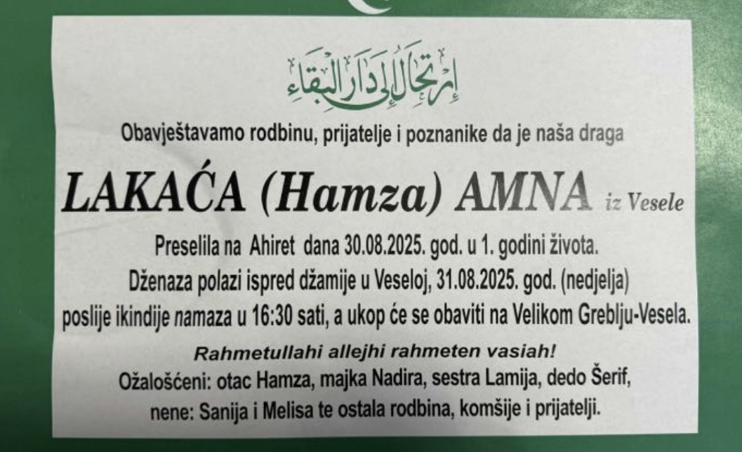 Dženaza polazi ispred džamije u Veseloj, 31.08.2025. god. (nedjelja) poslije ikindije namaza u 16:30 sati, a ukop će se obaviti na Velikom Greblju – Vesela.