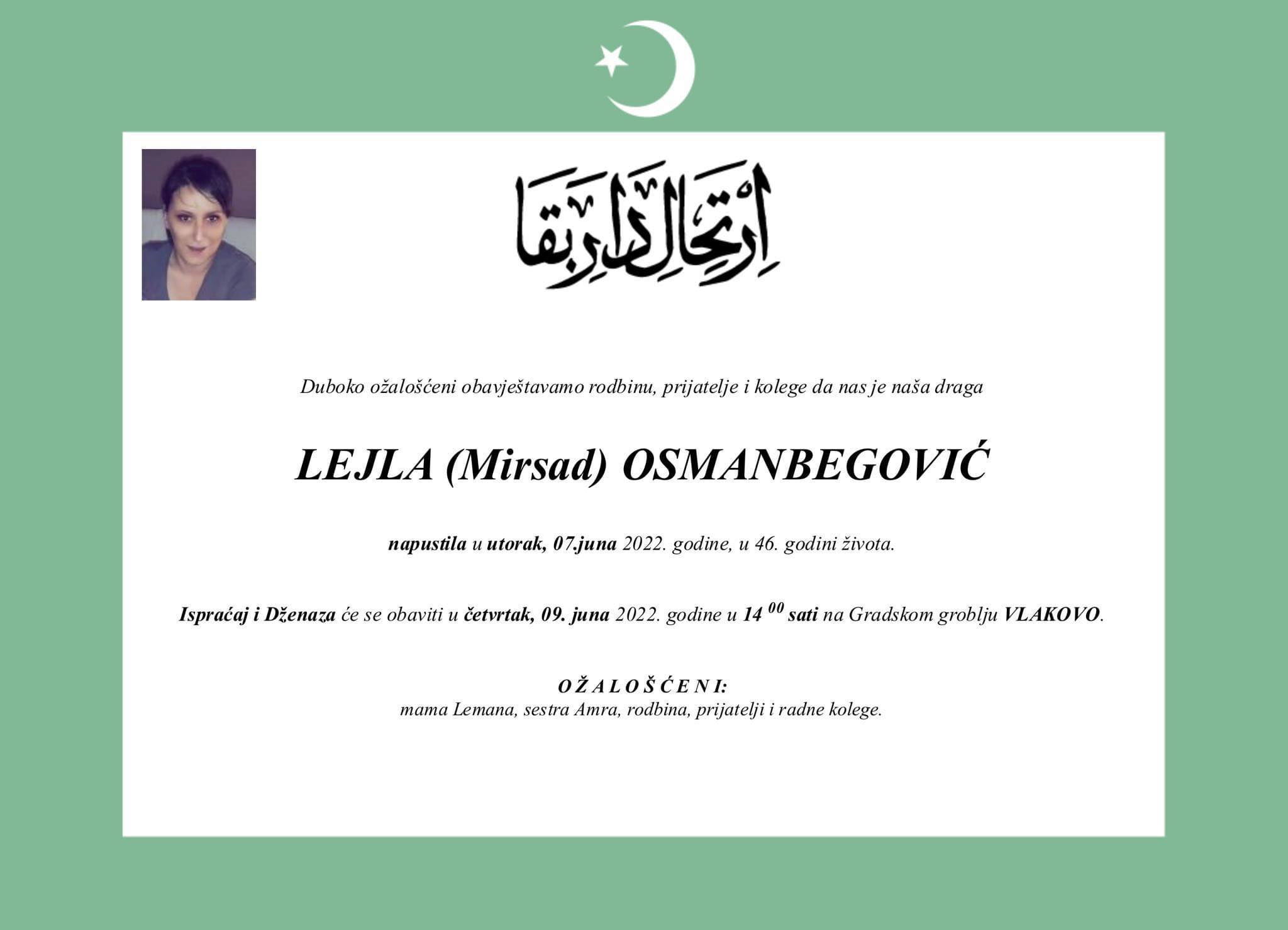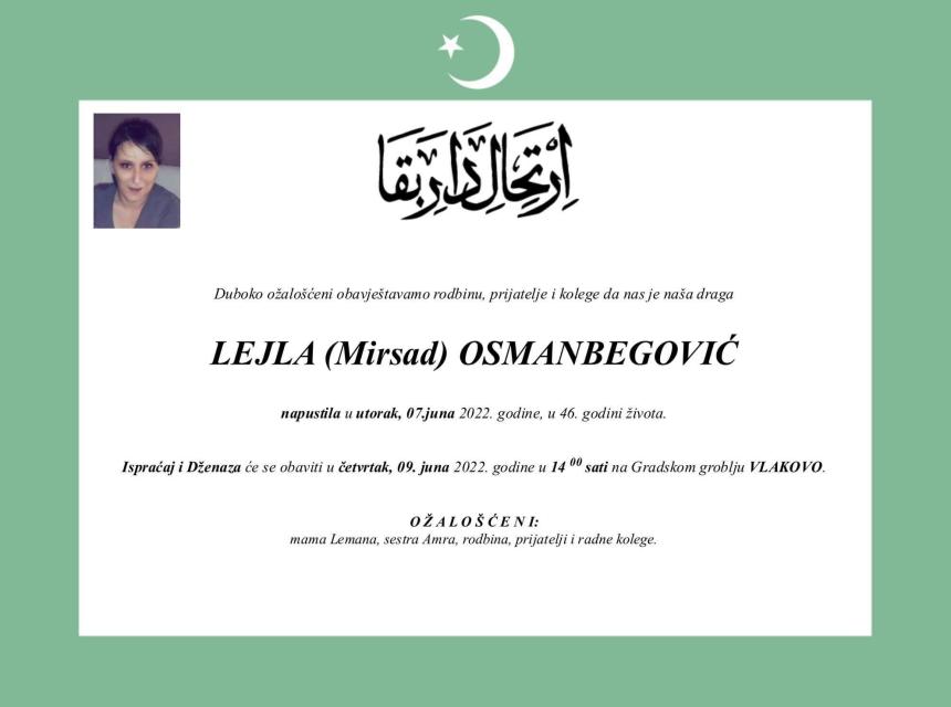 Tužnog srca i s bolom u duši obavještavamo rodbinu, komšije i prijatelje da je naša draga Lejla (Mirsad) Osmanbegović u 46. godini života preselila na Ahiret.
