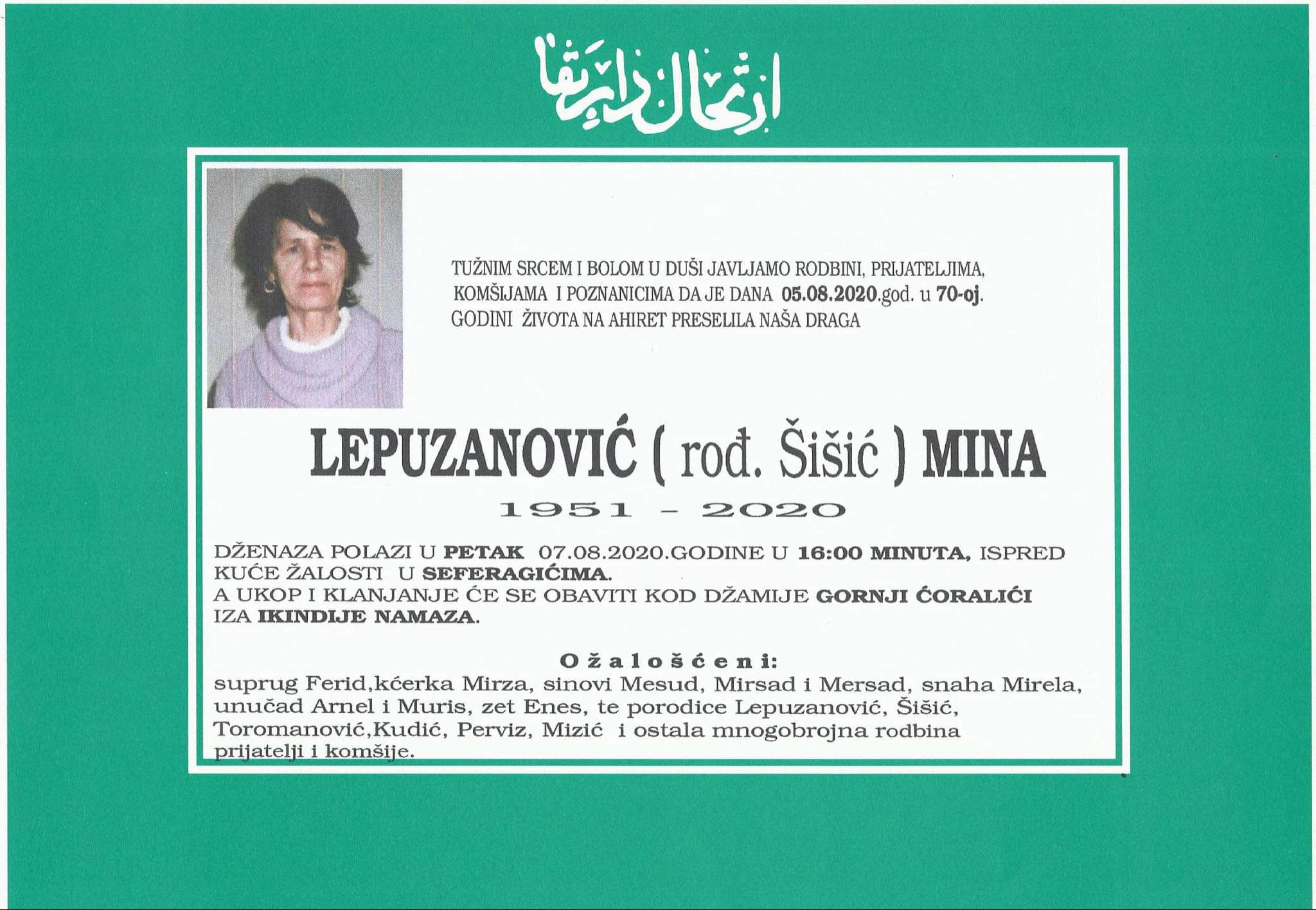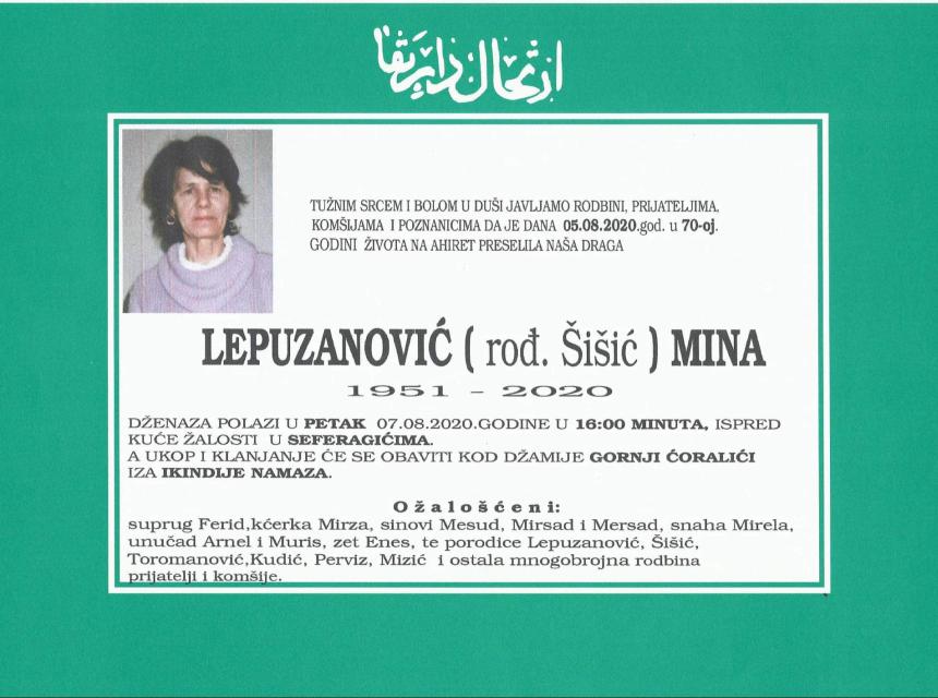 Tužnog srca i s bolom u duši obavještavamo rodbinu, komšije i prijatelje da je naša Lepuzanović (rođ. Šišić) Mina dana 5. augusta 2020. godine, u 70. godini života, preselila na Ahiret.