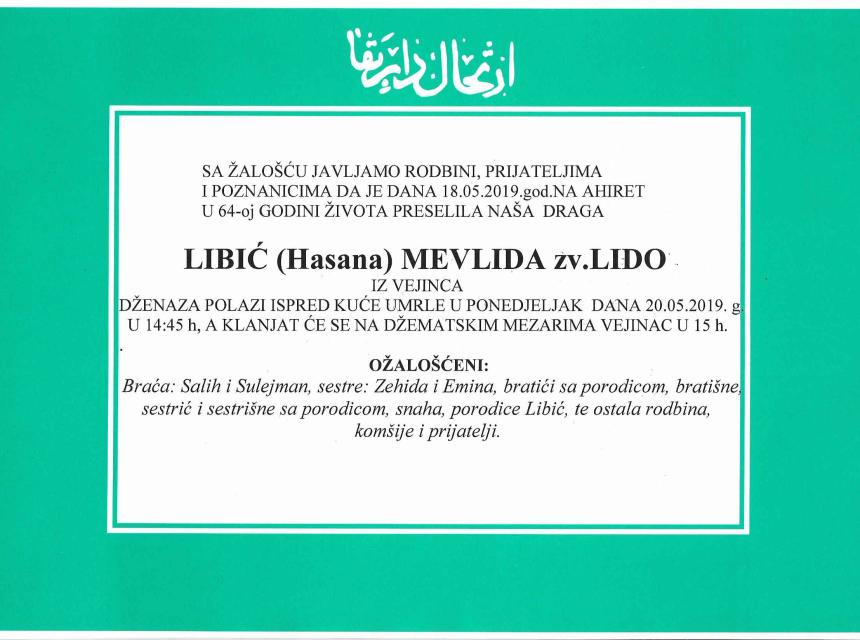Tužnim srcem i bolom u duši javljamo rodbini, prijateljima, komšijama i poznanicima da je dana 18.05.2019. god. u 64-oj. godini života preselila na Ahiret naša draga Libić (Hasana) Mevlida zv. Lido.