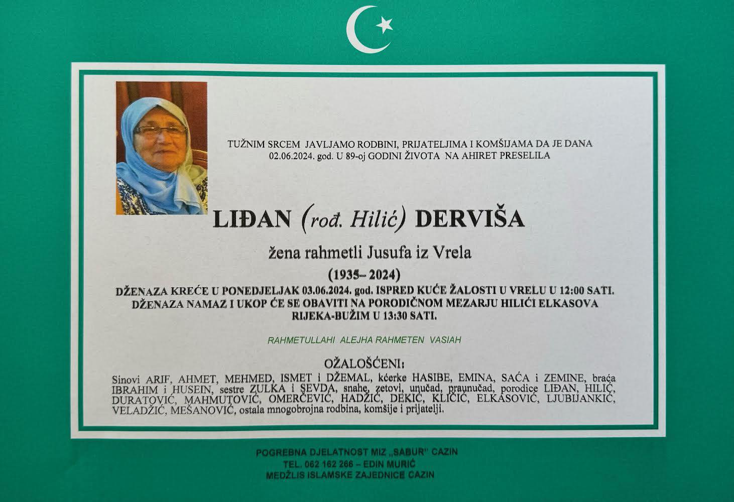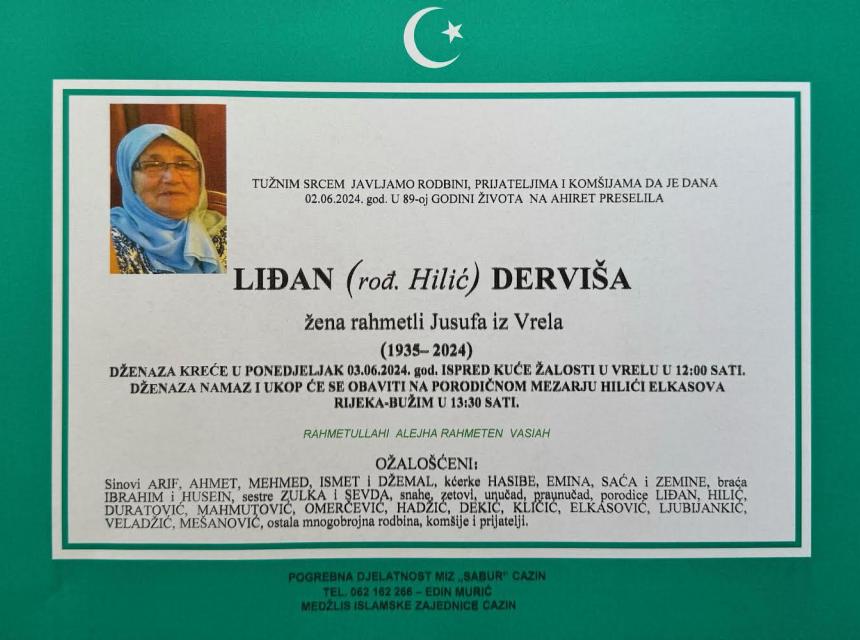 Tužnim srcem obavještavamo rodbinu prijatelje i komšije da je naša dragaLiđan (rođ. Hilić) Derviša preselila na Ahiret dana 02.06.2024. godine u 89-oj godini života.