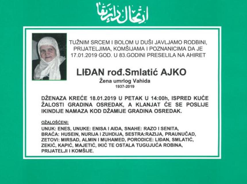 Tužnim srcem i bolom u duši javljamo rodbini, prijateljima i komšijama da je dana 17.01.2019. god. u 83. godini života na Ahiret preselila Liđan (rođ. Smlatić) Ajko, žena umrlog Vahida.
