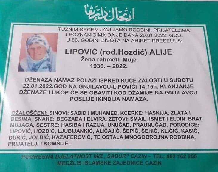 Tužnog srca i s bolom u duši obavještavamo rodbinu, komšije i prijatelje da je naša draga Lipović (Hozdić) Alije u 86. godini života dana 20.1.2022. preselila na ahiret.