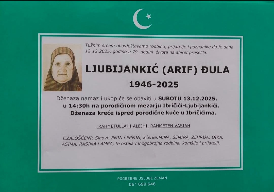 Tužnim srcem obavještavamo rodbinu, prijatelje i poznanike da je dana 12.12.2025. godine u 79. godini života na ahiret preselila LJUBIJANKIĆ (ARIF) ĐULA.