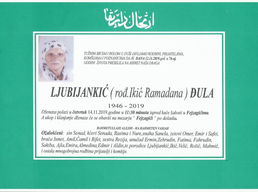 Tužnim srcem i bolom u duši javljamo rodbini, prijateljima, komšijama i poznanicima da je dana 12.11.2019. godine u 74-toj godini života na Ahiret preselila naša draga Ljubijankić (rođ. Ikić Ramadana) Đula.