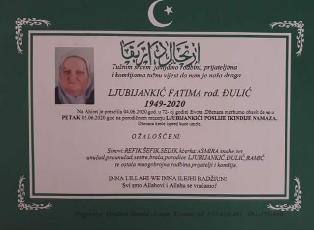 Tužnim srcem i bolom u duši javljamo rodbini i prijateljima da je naša draga i nikad prežaljena Ljubijankić (Đulić) Fatima dana 04.06.2020. godine u 72-oj godini života preselila na Ahiret.
