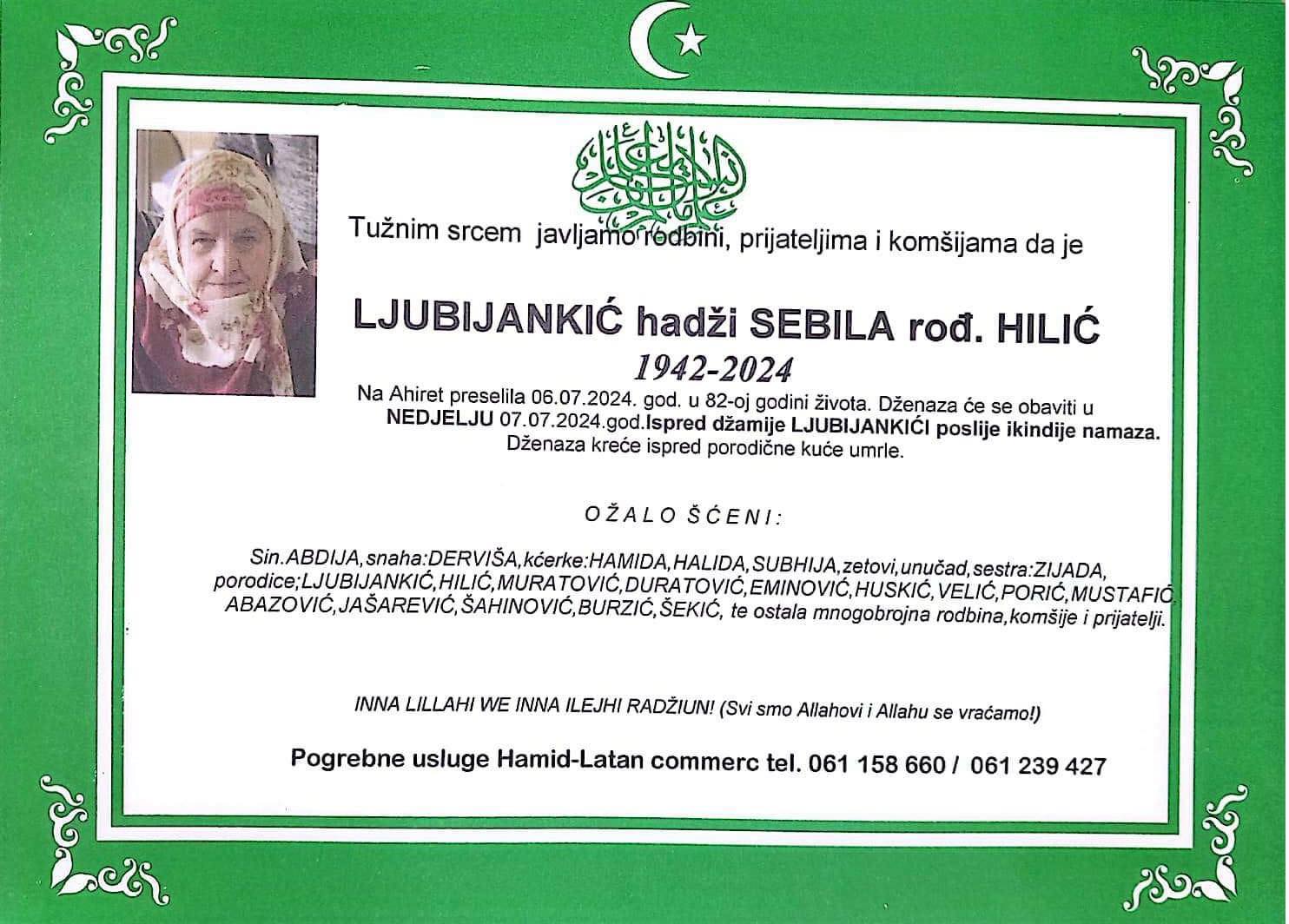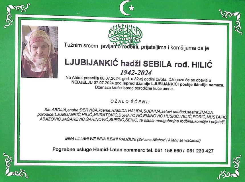 Tužnim srcem i bolom u duši javljamo rodbini, prijateljima i komšijama da je naša draga Ljubijankić hadži Sebila rođ. Hilić, dana 06.07.2024. godine u 82-oj godini života, preselila na Ahiret.
