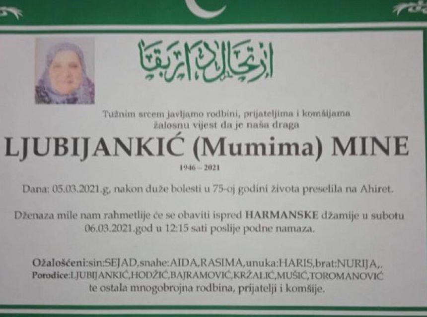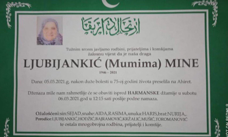 Tužnog srca i s bolom u duši obavještavamo rodbinu, komšije i prijatelje da je naša draga Ljubijankić (Mumima) Mine, dana 05.03.2021 godine, u 75-oj godini života, preselila na Ahiret.