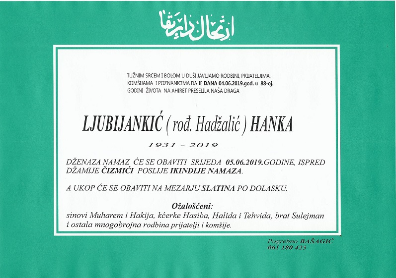 Tužnim srcem i bolom u duši javljamo rodbini, prijateljima, komšijama i poznanicima da je 04.06.2019. godine u 88.-oj godini života na Ahiret preselila naša draga Ljubijankić (rođ. Hadžalić) Hanka.