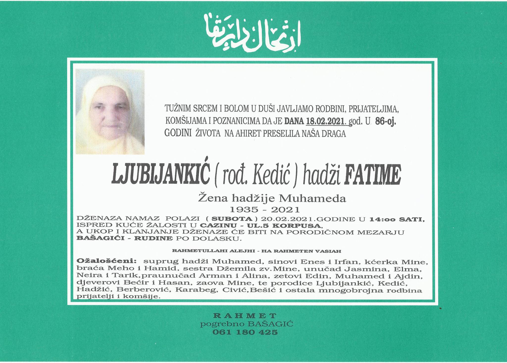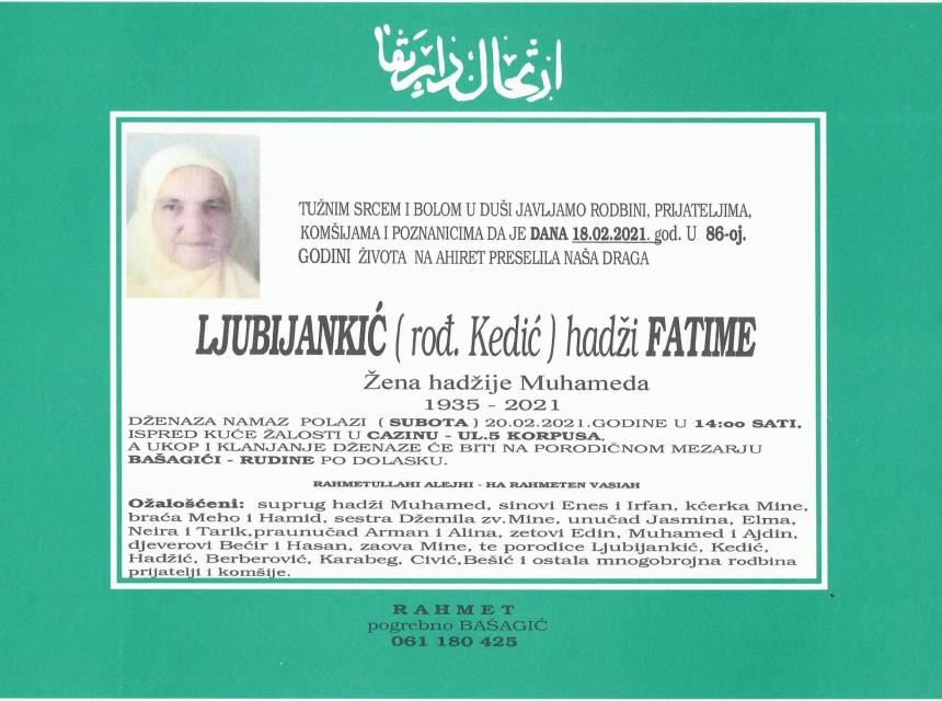 Tužnog srca i s bolom u duši obavještavamo rodbinu, komšije i prijatelje da je naša draga Ljubijankić (rođ. Kedić) hadži Fatime preselila na Ahiret dana 18.02.2021. godine u 86. godini života.
