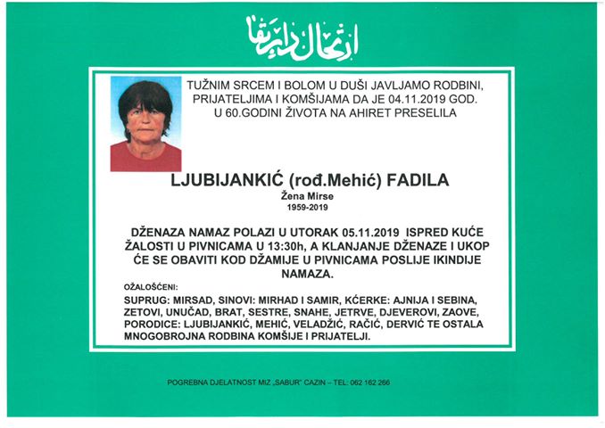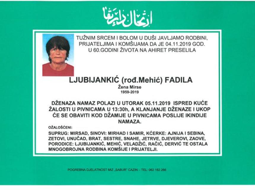 Sa žalošću, bolom i tugom javljamo rodbini, prijateljima i poznanicima da je naša draga Ljubijankić (rođ. Mehić) Fadila, 04.11.2019.g. preselila na Ahiret u 60. g. života.