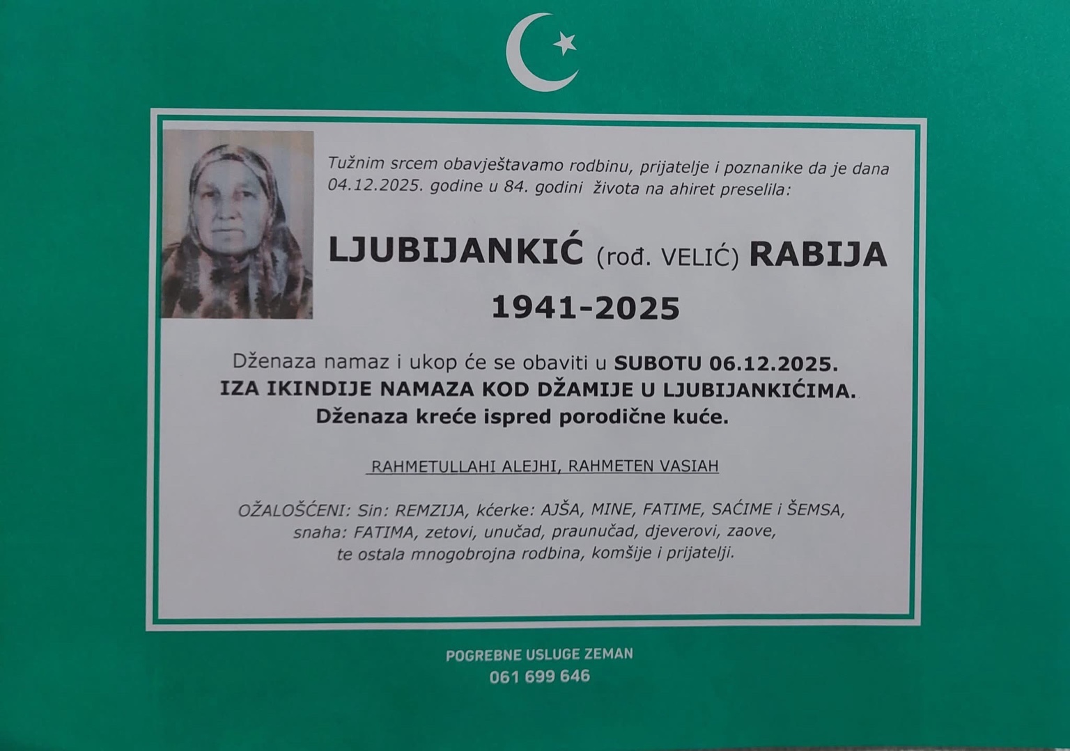 Dženaza-namaz i ukop će se obaviti u subotu 06.12.2025. iza ikindije-namaza kod džamije u Ljubijankićima.