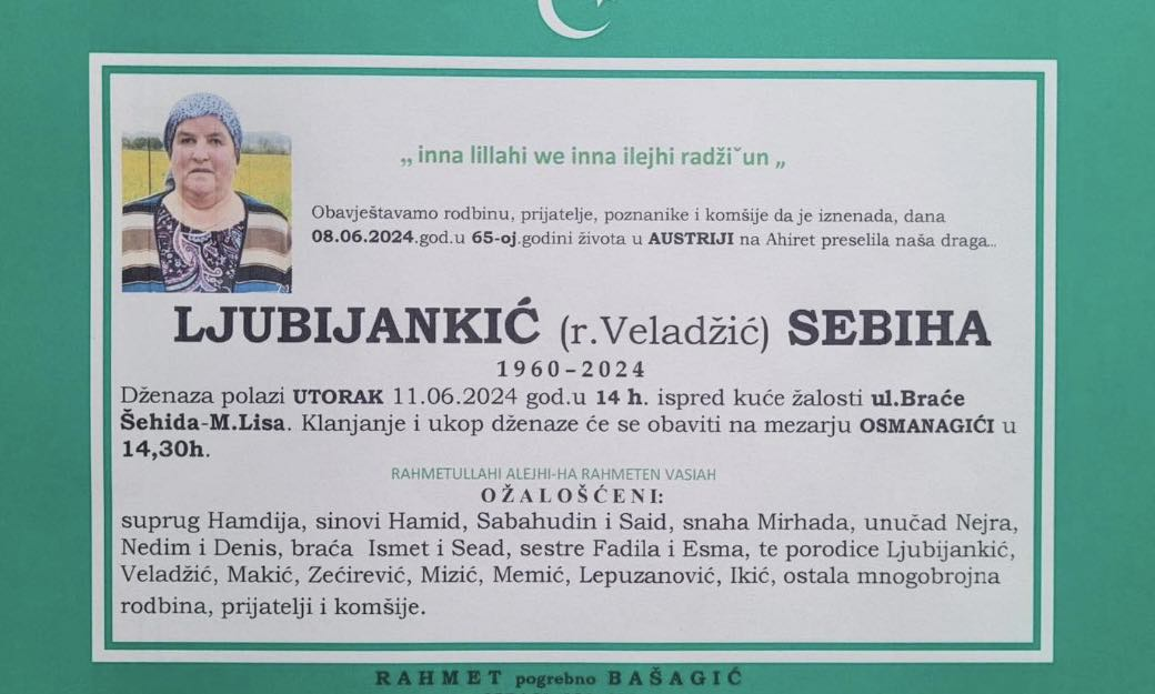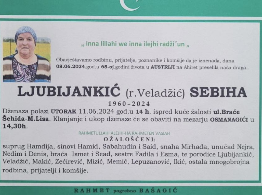 Obavještavamo rodbinu, prijatelje, poznanike i komšije da je iznenada , dana 08.06.2024.god. u 65-oj godini života u Austriji na Ahiret preselila naša draga.
