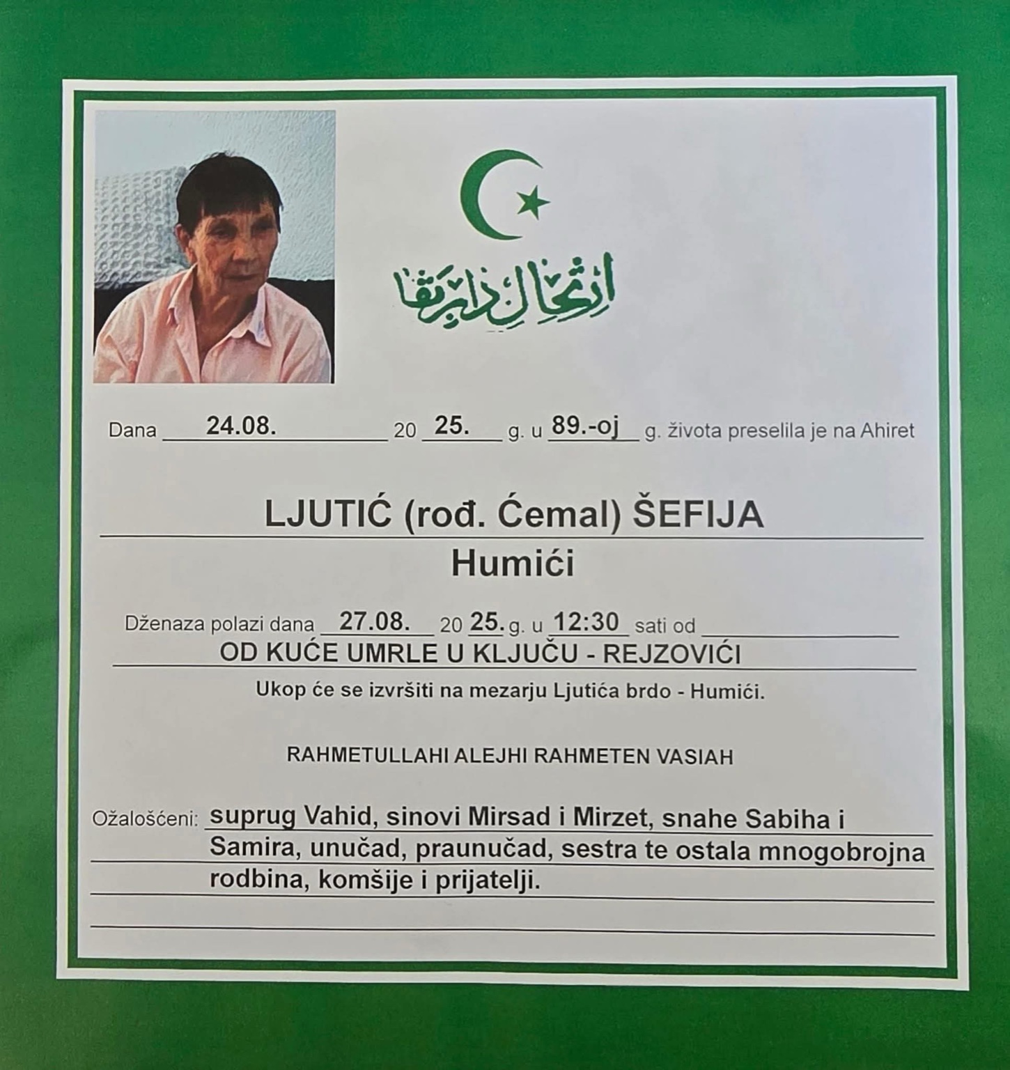 Dženaza polazi dana 27.08.2025. u 12:30 sati od kuće umrle u Ključu – Rejzovići.