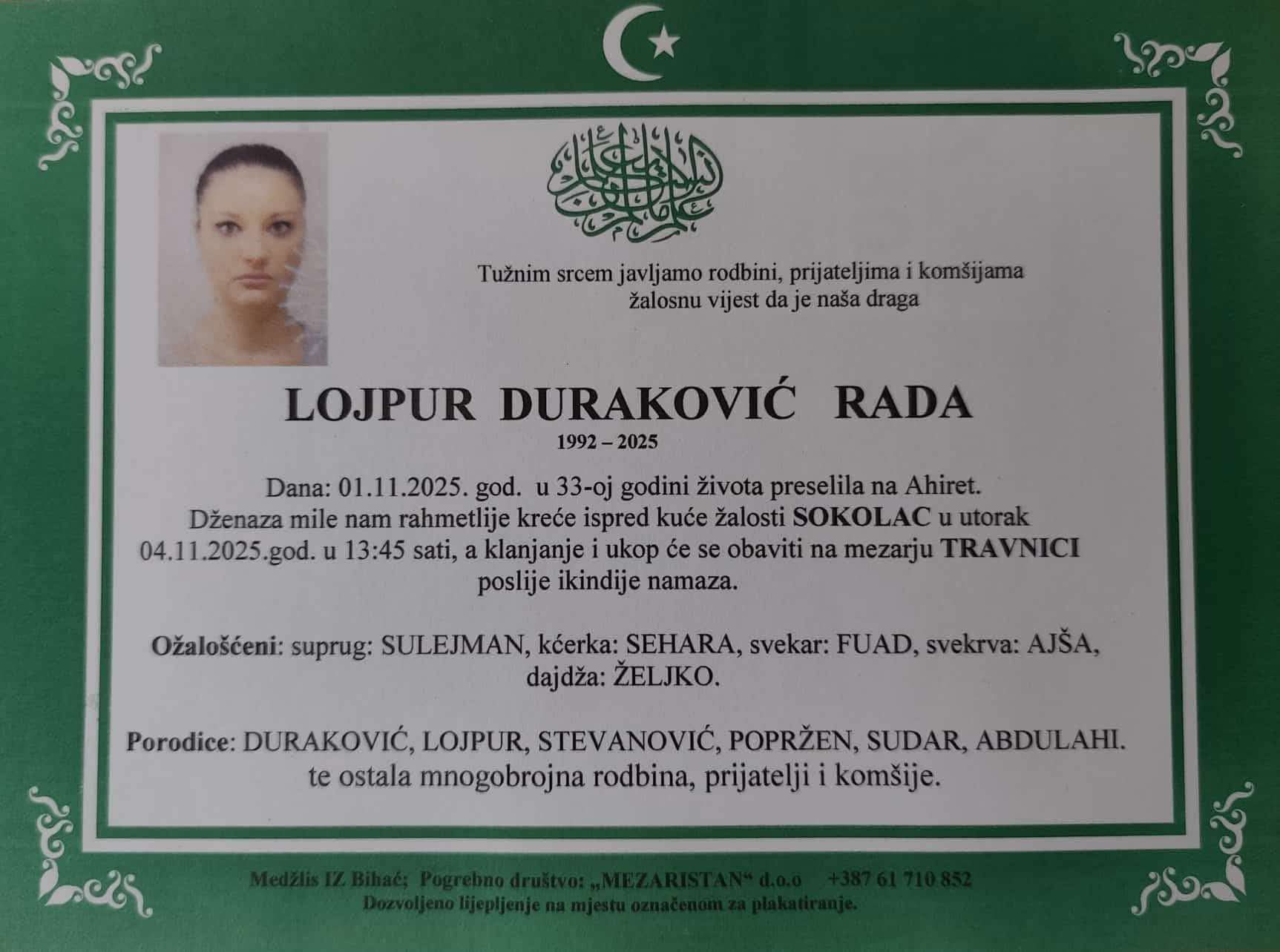 Dženaza mile nam rahmetlije kreće ispred kuće žalosti SOKOLAC u utorak 04.11.2025. god. u 13:45 sati, a klanjanje i ukop će se obaviti na mezarju TRAVNICI poslije ikindije namaza.