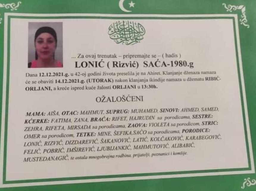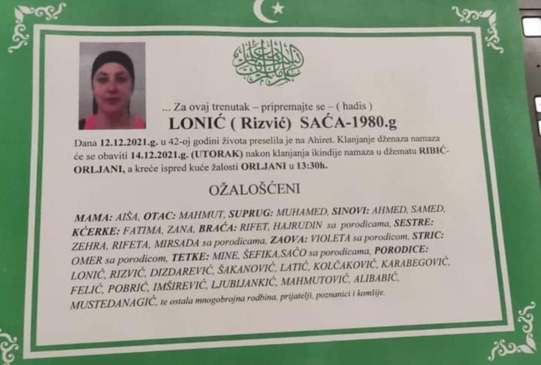 Tužnog srca i s bolom u duši obavještavamo rodbinu, komšije i prijatelje da je naša draga Lonić (Rizvić) Saća dana 12.12.2021. u 42. godini života preselila na ahiret