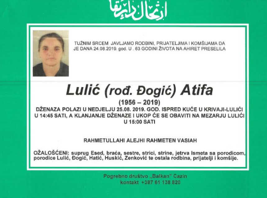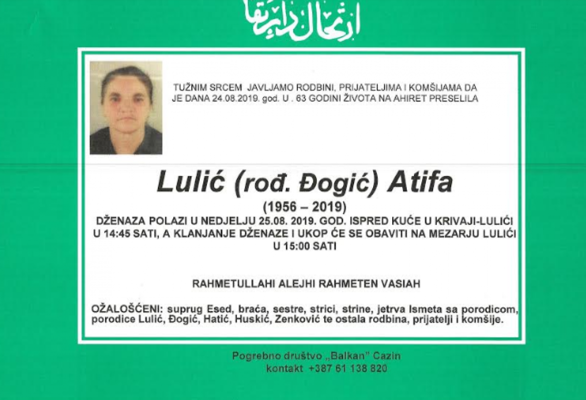 Tužnim srcem javljamo rodbini, prijateljima i komšijama da je dana 24.08.2019.god. u 63 godini života na Ahiret preselila Lulić (rođ. Đogić) Atifa.
