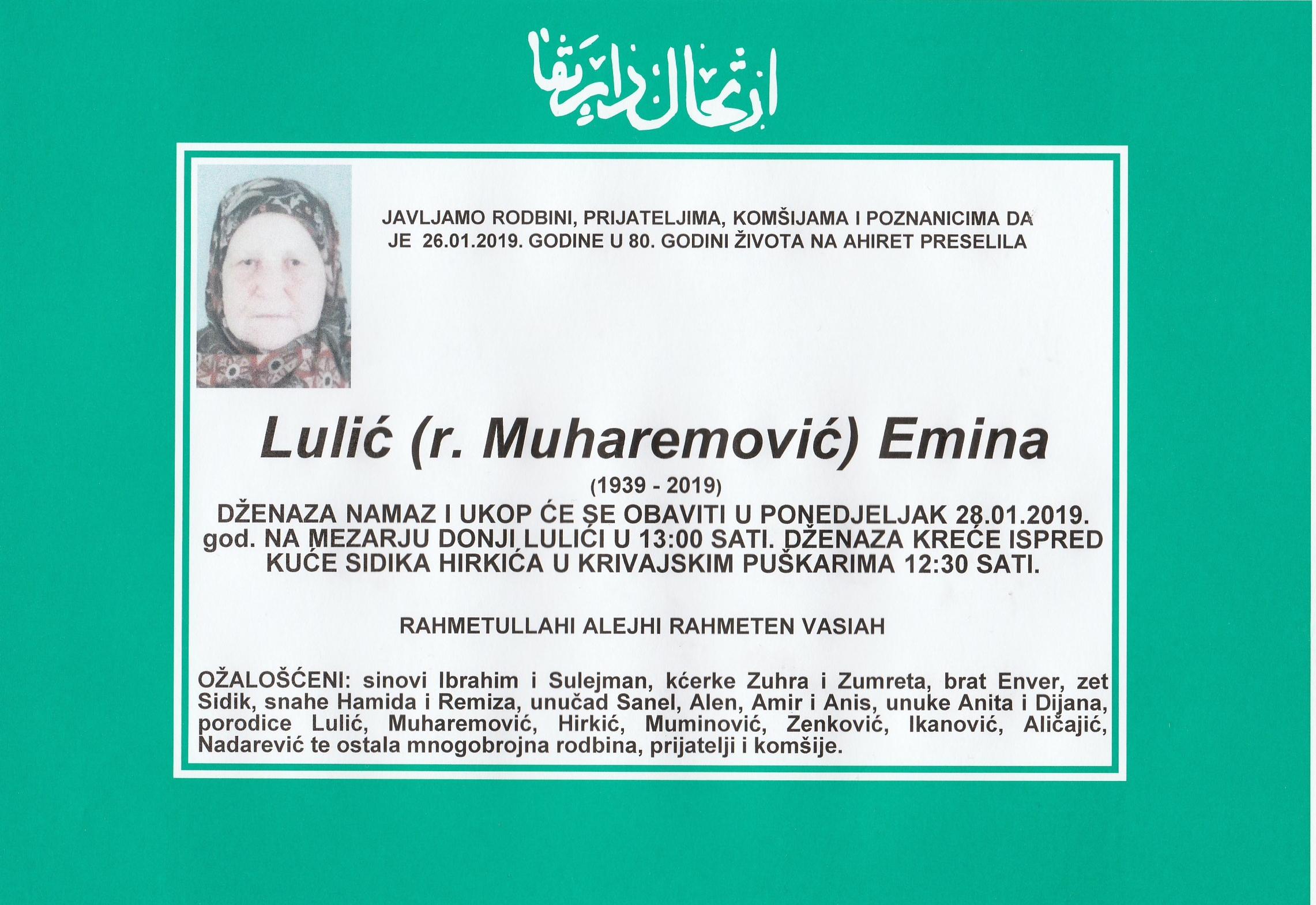 Javljamo rodbini, komšijama i prijateljima da je 26.01.2019.g. u 80.godini života na Ahiret preselila Lulić (rođ. Muhamremović) Emina.