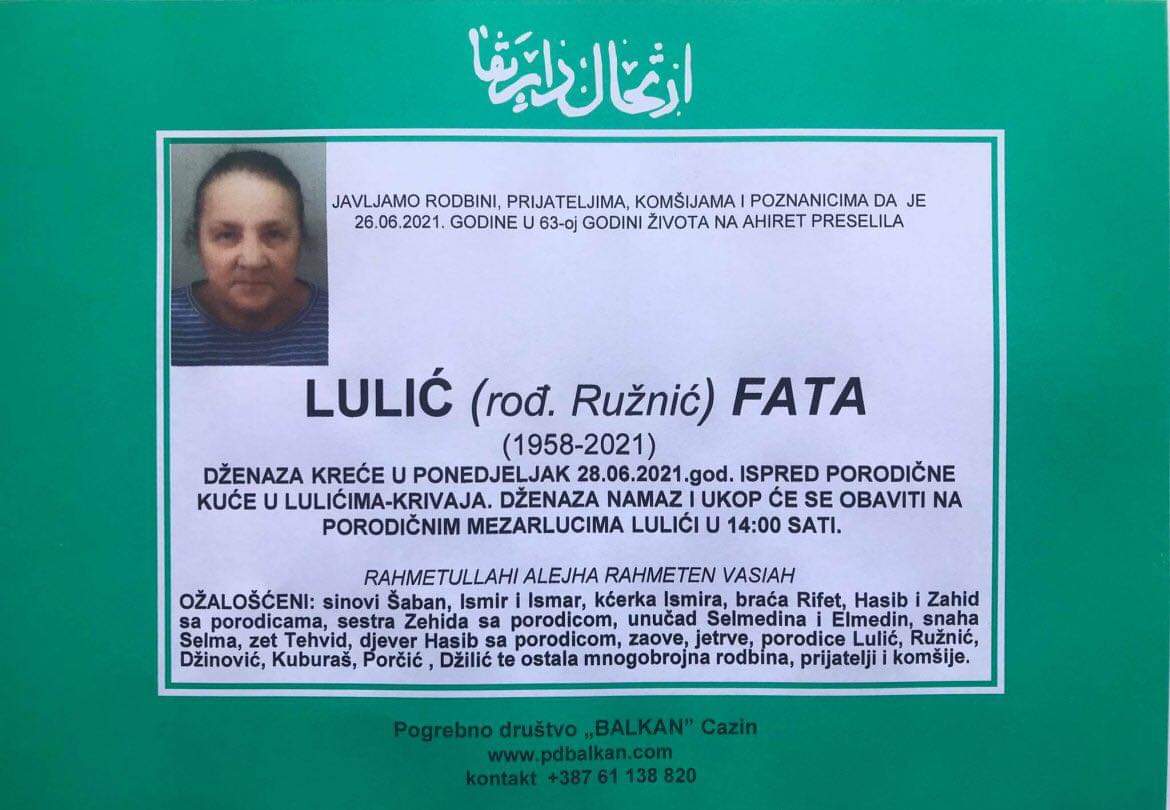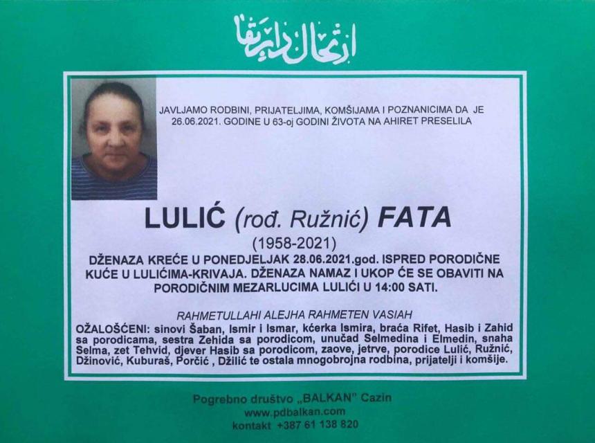 Tužnog srca i s bolom u duši obavještavamo rodbinu, komšije i prijatelje da je naša draga Lulić (rođ. Ružnić) Fata dana 26.06.2021. godine, u 63. godini života, preselila na ahiret.