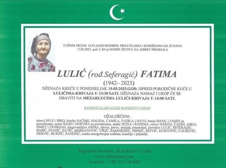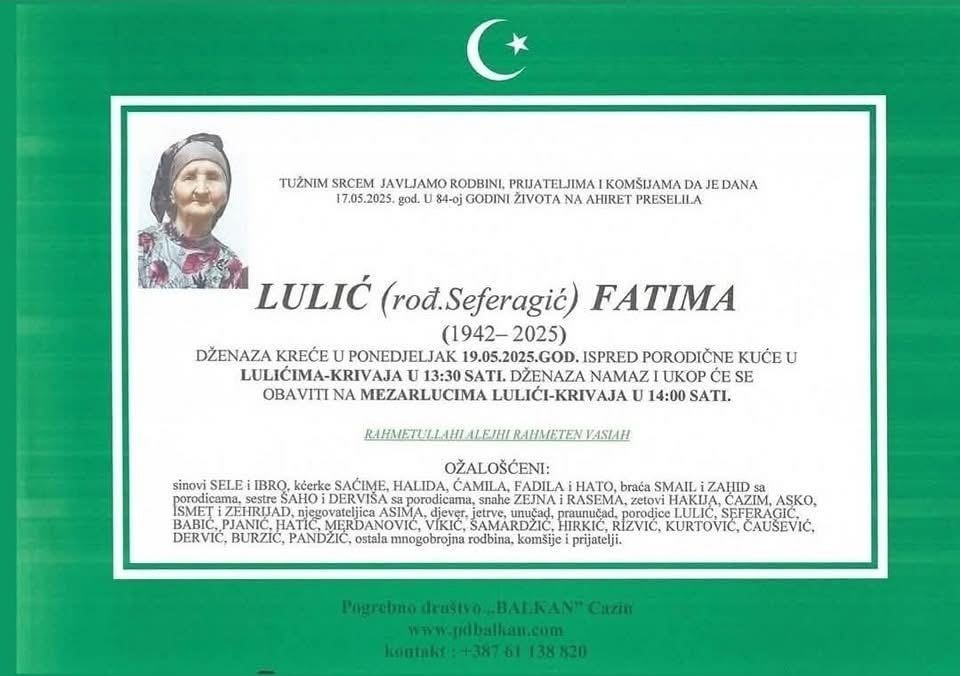 Tužnim srcem jjavljamo rodbini, prijateljima i poznanicima da je dana 17.05.2025. godine u 84-oj godini života, na ahiret preselila naša draga Lulić (rođ. Seferagić) Fatima