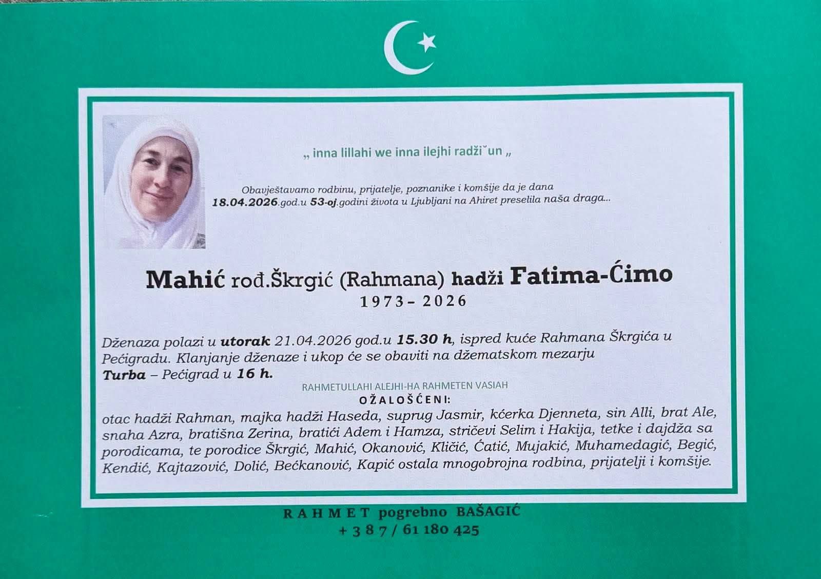 Dženaza polazi u utorak 21.04.2026. god. u 15.30 h, ispred kuće Rahmana Škrgića u Pećigradu. Klanjanje dženaze i ukop će se obaviti na džematskom mezarju Turba – Pećigrad u 16 h.