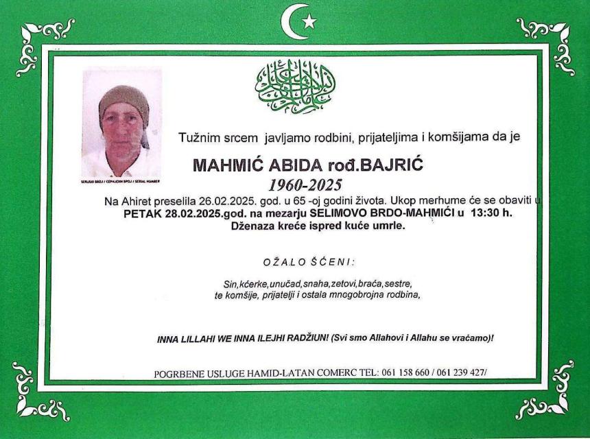 Tužnim srcem javljamo rodbini, prijateljima i komšijama da je Mahmić Abida rođ. Bajrić na ahiret preselila 26.02.2025.god. u 65-oj godini života. Ukop će se obaviti u PETAK 28.02.2025.god. na mezarju SELIMOVO-BRDO MAHMIĆI U 13:30 h