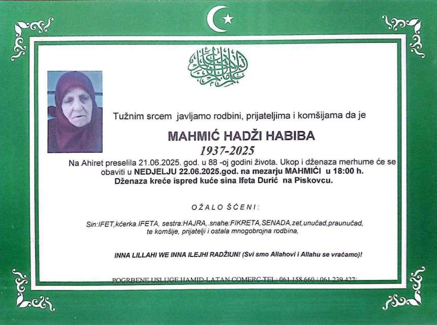 Tužnim srcem i bolom u duši javljamo rodbini, prijateljima i komšijama da je naša draga Mahmić hadži Habiba, dana 21.06.2025. godine u 88-oj godini života, preselila na Ahiret.