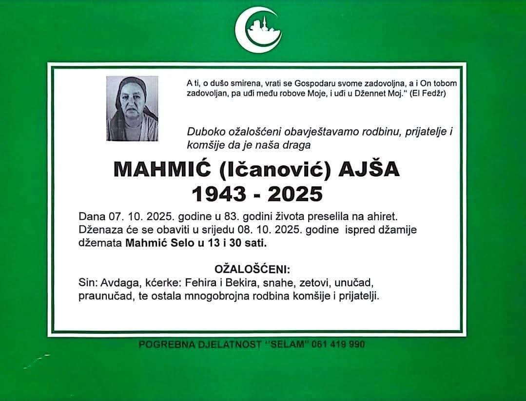 Dženaza će se obaviti u srijedu 08.10.2025. godine ispred džamije džemata Mahmić Selo u 13 i 30 sati.