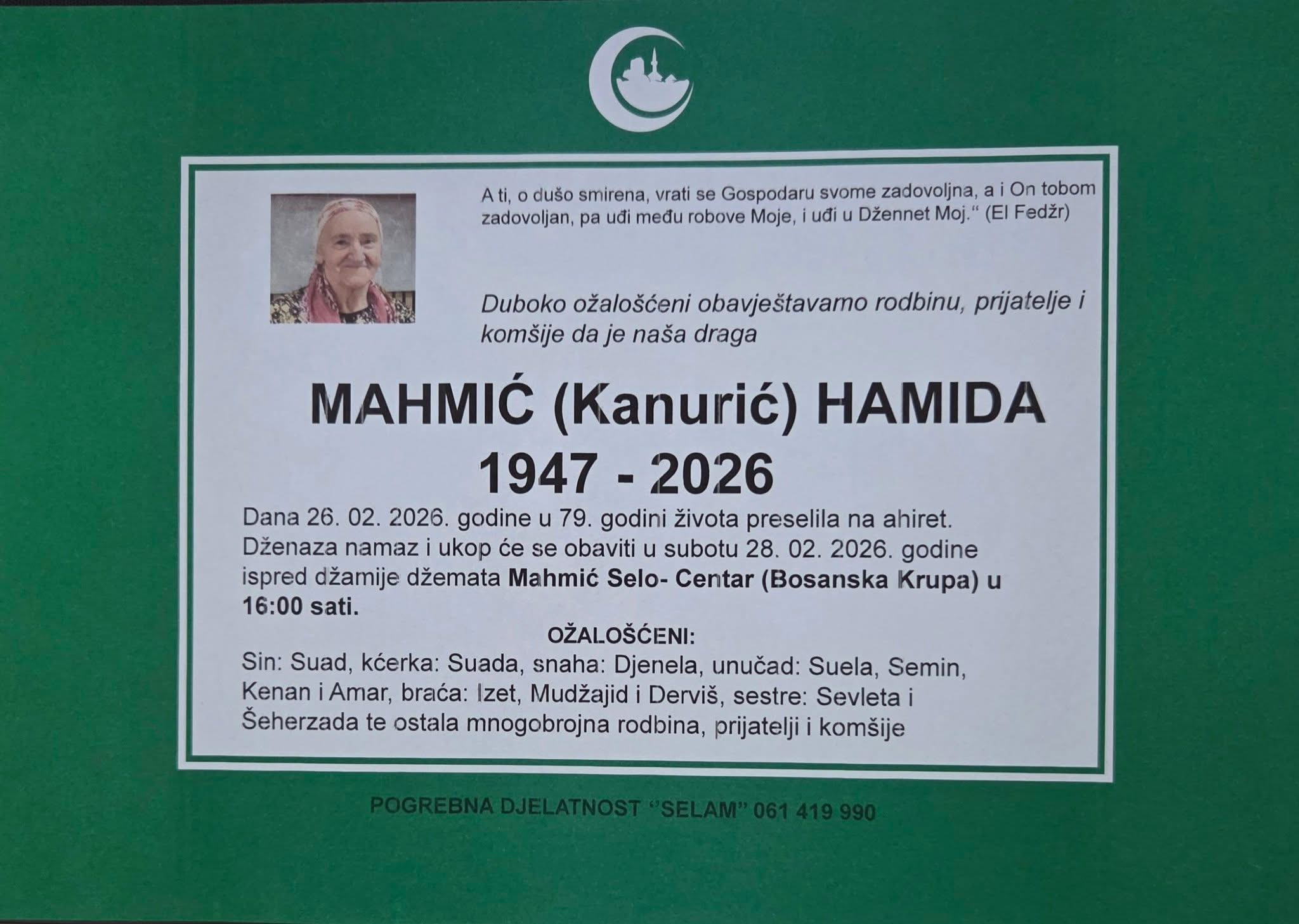Dženaza-namaz i ukop obavit će se u subotu, 28. 2. 2026. godine, ispred džamije džemata Mahmić Selo – Centar (Bosanska Krupa) u 16.00 sati.