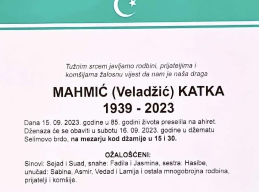 Tužnim srcem javljamo rodbini, prijateljima i komšijama žalosnu vijest da nam je naša draga MAHMIĆ (Veladžić) dana 15. 09. 2023. godine u 85. godini života preselila na Ahiret.
