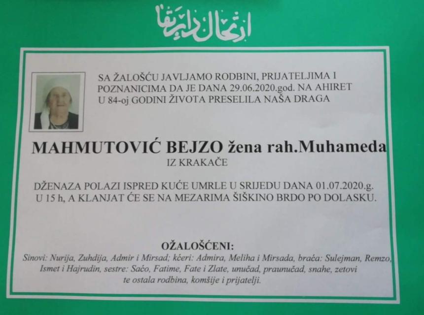 Tužnog srca i s bolom u duši obavještavamo rodbinu, komšije i prijatelje da je naša draga Mahmutović Bejzo, žena rahm. Muhameda, dana 29.06.2020. godine, u 84-toj godini života preselila na Ahiret.