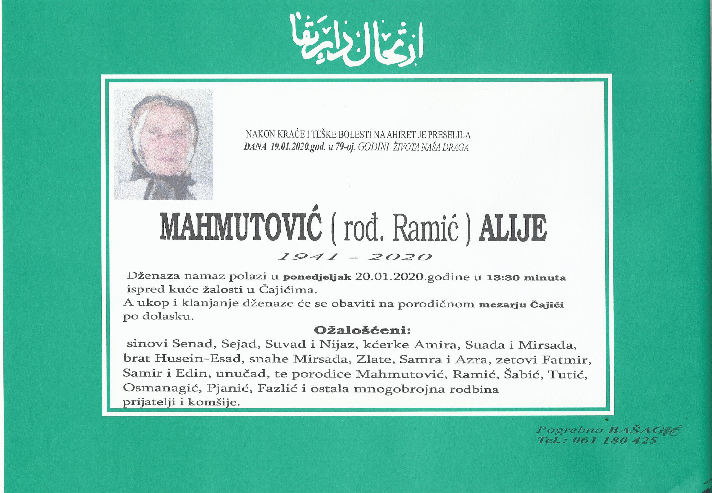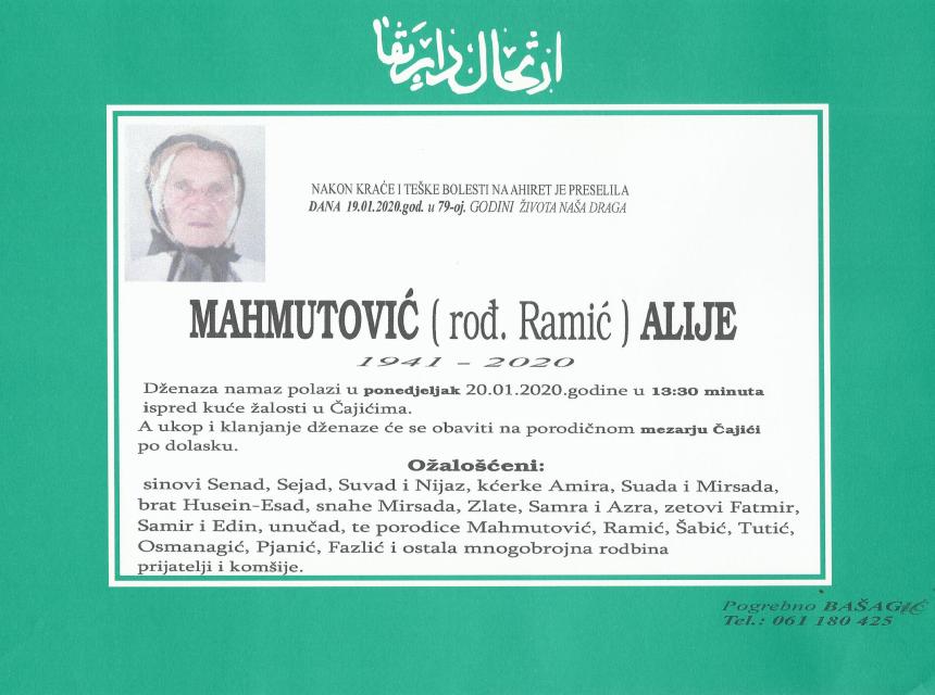 Tužnim srcem i bolom u duši javljamo rodbini i prijateljima da je naša draga i nikad prežaljenaMahmutović (rođ. Ramić) Alije, dana 19.01.2020. godine u 79. godini života preselila na Ahiret.