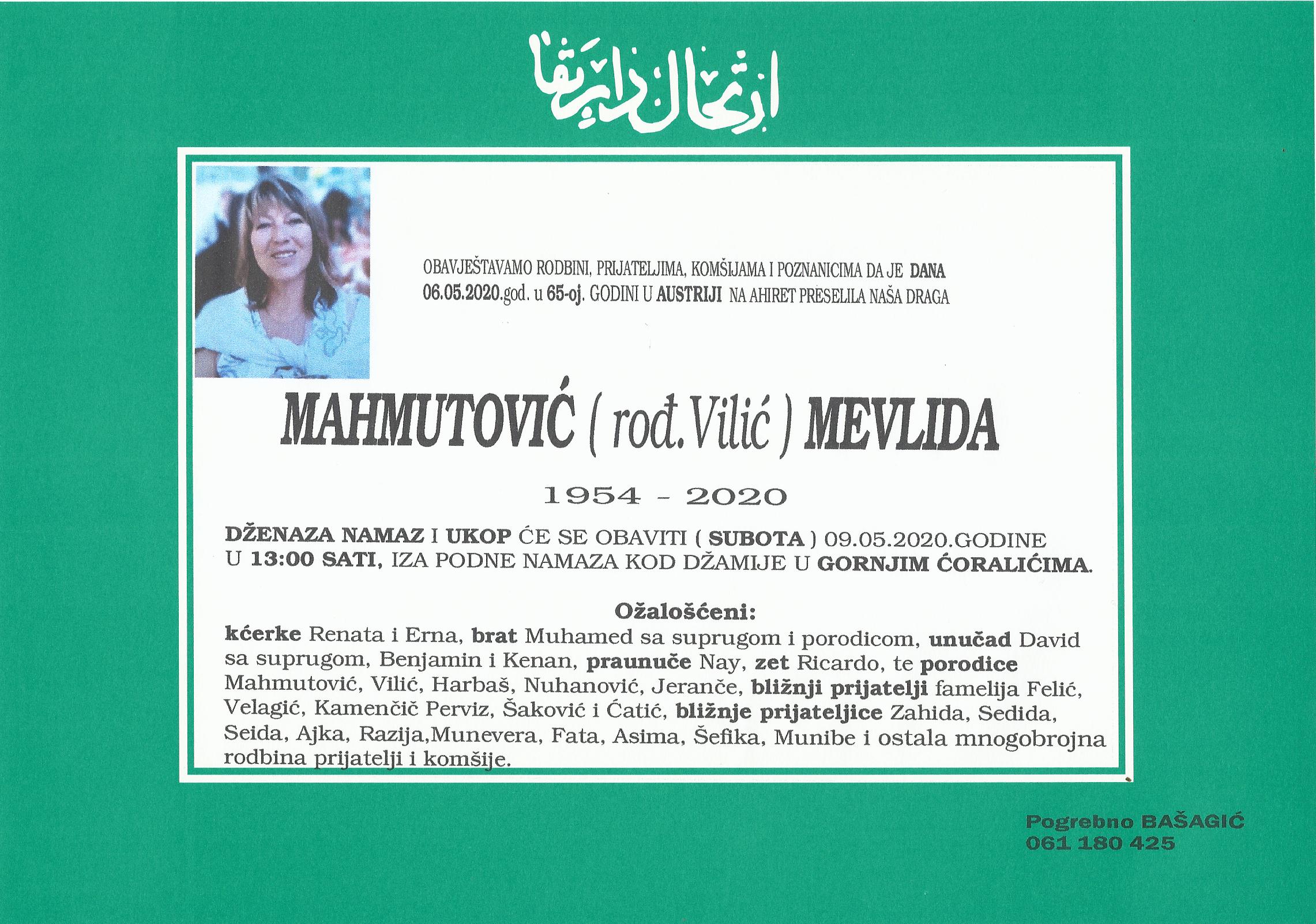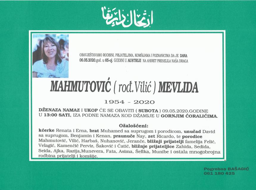 Tužnim srcem i bolom u duši javljamo rodbini i prijateljima da je naša draga i nikad prežaljena Mahmutović (Vilić) Mevlida dana 06.05.2020. godine u 65-toj godini života preselila na Ahiret.