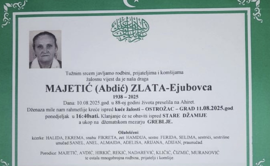 Dženaza mile nam rahmetlije kreće ispred kuće žalosti – OSTROŽAC – GRAD dana 11.08.2025. godine (ponedjeljak) u 16:40 sati.
