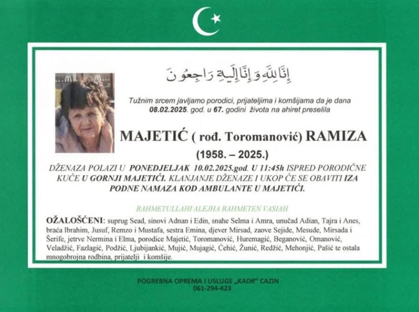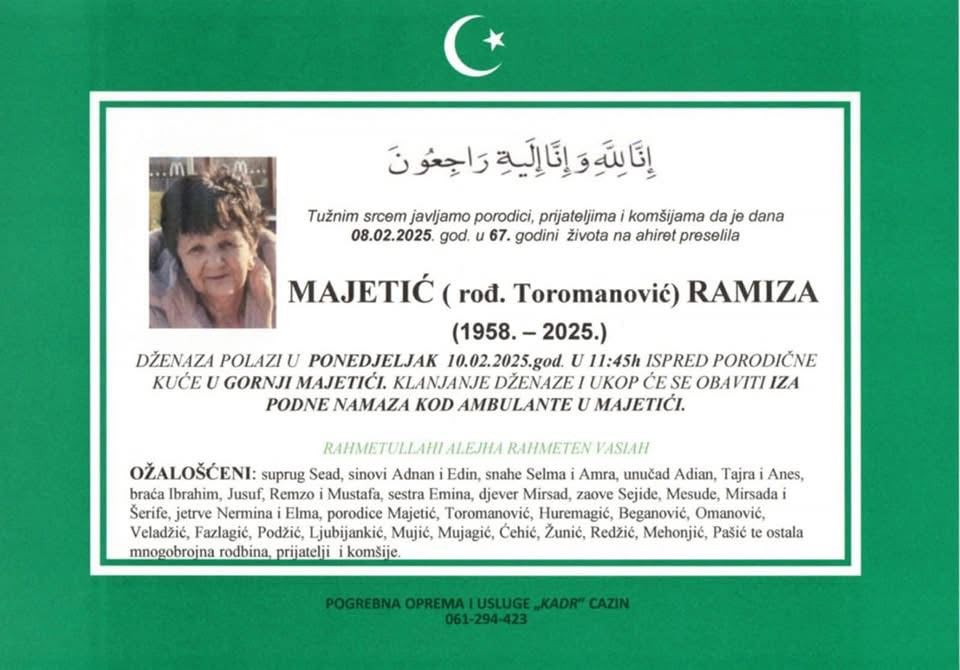 Tužnim srcem i bolom u duši javljamo rodbini, prijateljima i komšijama da je naša draga Majetić (rođ. Toromanović) Ramiza, dana 08.02.2025. godine u 67-oj godini života, preselila na Ahiret.