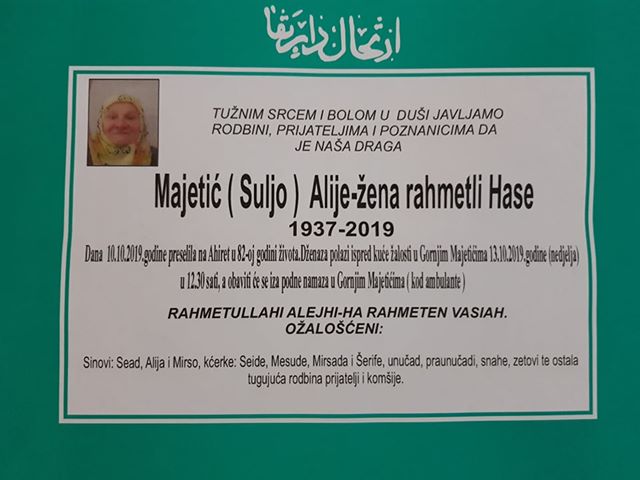 Tužnim srcem i bolom u duši javljamo rodbini, prijateljima i poznanicima da je naša draga Majetić (Suljo) Alije dana 10.10.2019. godine preselila na Ahiret u 82.-oj godini života.