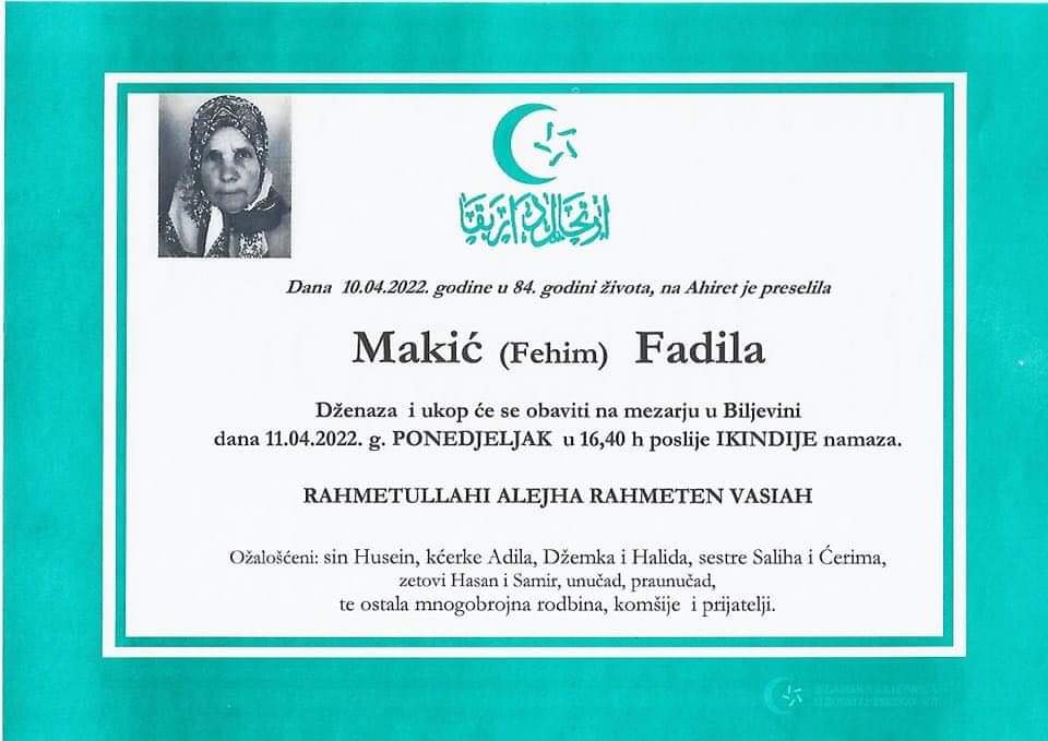 Tužnog srca i s bolom u duši obavještavamo rodbinu, komšije i prijatelje da je naša draga Makić (Fehim) Fadila u 84. godini života preselila na Ahiret.