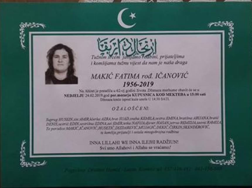 Tužnim srcem javljamo rodbini, prijateljima i komšijama žalosnu vijest da je u 62. godini života na Ahiret preselila Makić (rođ.Ičanović) Fatima.