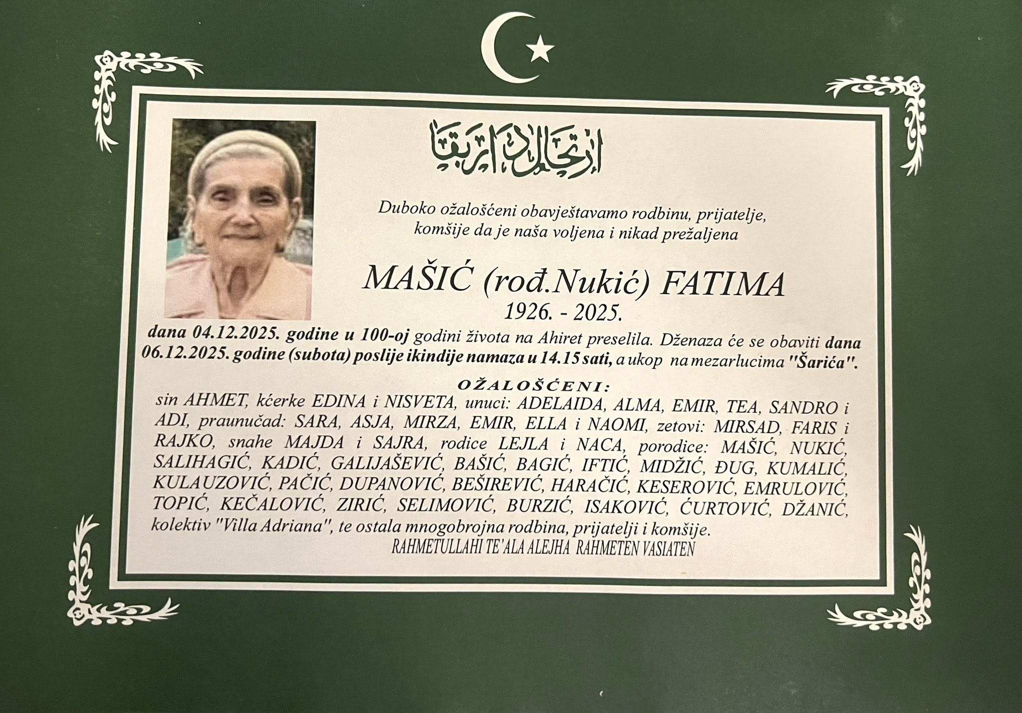 Duboko ožalošćeni obavještavamo rodbinu, prijatelje, komšije da je naša voljena i nikad prežaljena MAŠIĆ (rođ. Nukić) FATIMA dana 04.12.2025. godine u 100-oj godini života na Ahiret preselila.
