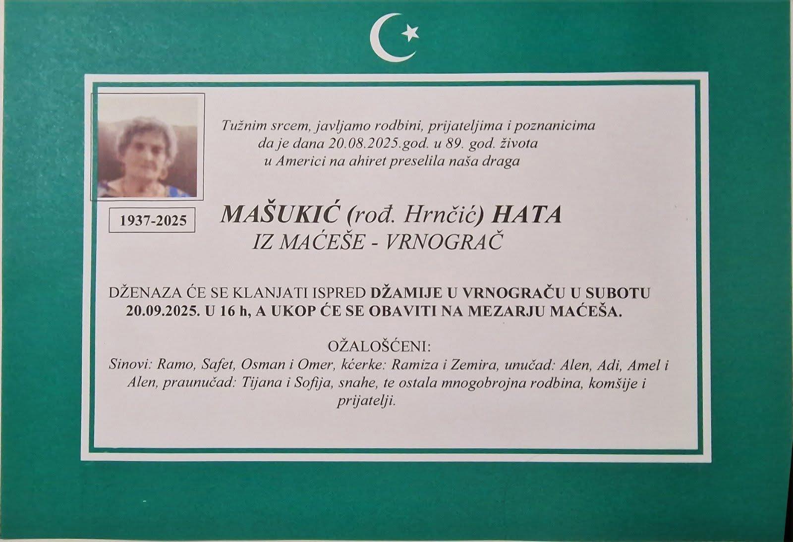 Tužnim srcem i bolom u duši javljamo rodbini, prijateljima i komšijama da je naša draga Mašukić (rođ. Hrnčić) Hata, dana 20.08.2025. godine u 89-oj godini života u Americi, preselila na Ahiret.