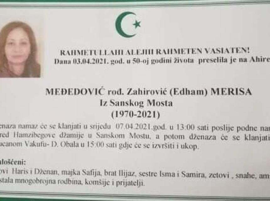 Tužnog srca i s bolom u duši obavještavamo rodbinu, komšije i prijatelje da je naša draga Međedović rođ Zahirović (Edham) Merisa dana 03.04.2021. godine, u 50. godini života, preselila na Ahiret.