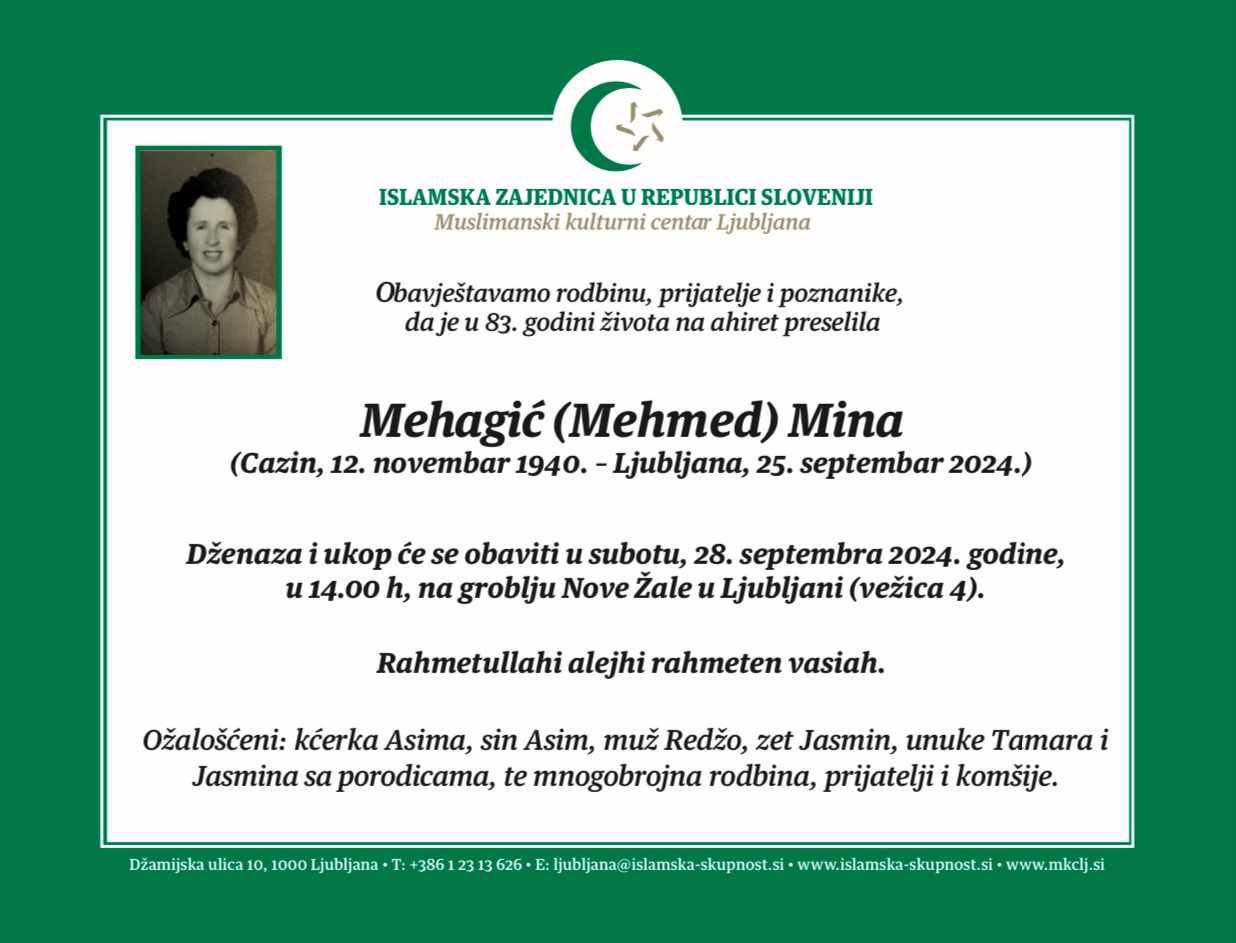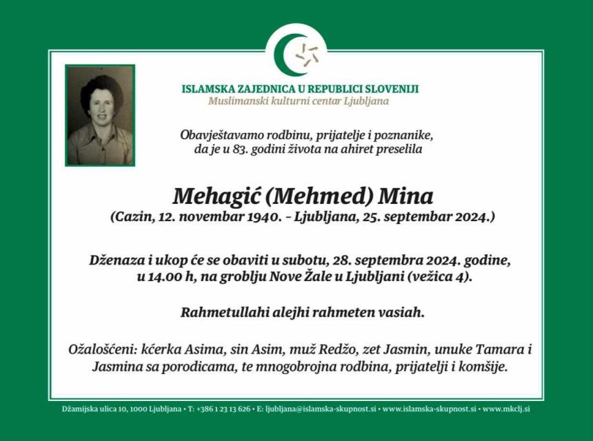 Sa žalošću obavještavamo rodbinu prijatelje i komšije da je naša draga Mehagić (Mehmed) Mina dana 25.09.2024. u 83. godini života preselila na Ahiret.