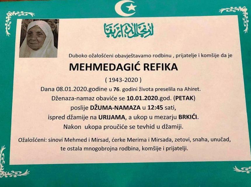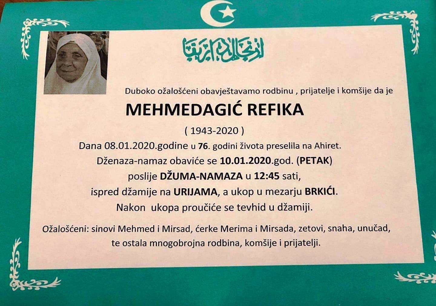 Tužnim srcem i bolom u duši javljamo rodbini, prijateljima, komšijama i poznanicima da je dana 08.01.2020 god. U 76-oj godini života na Ahiret preselila naša draga Mehmedagić Refka.