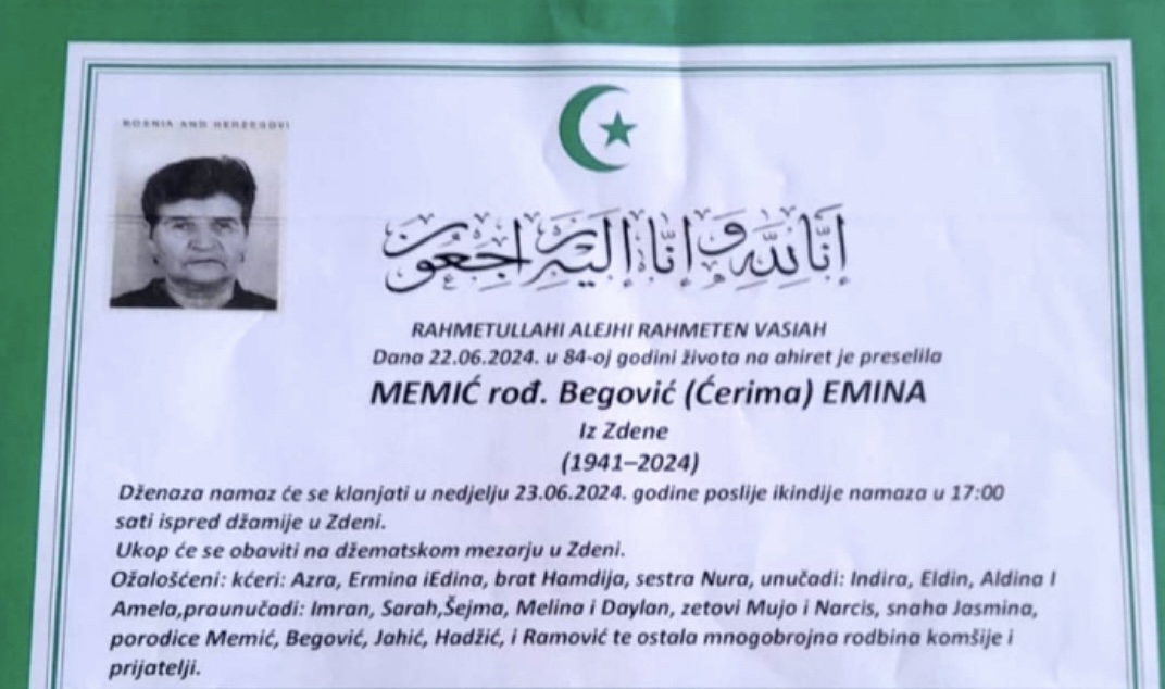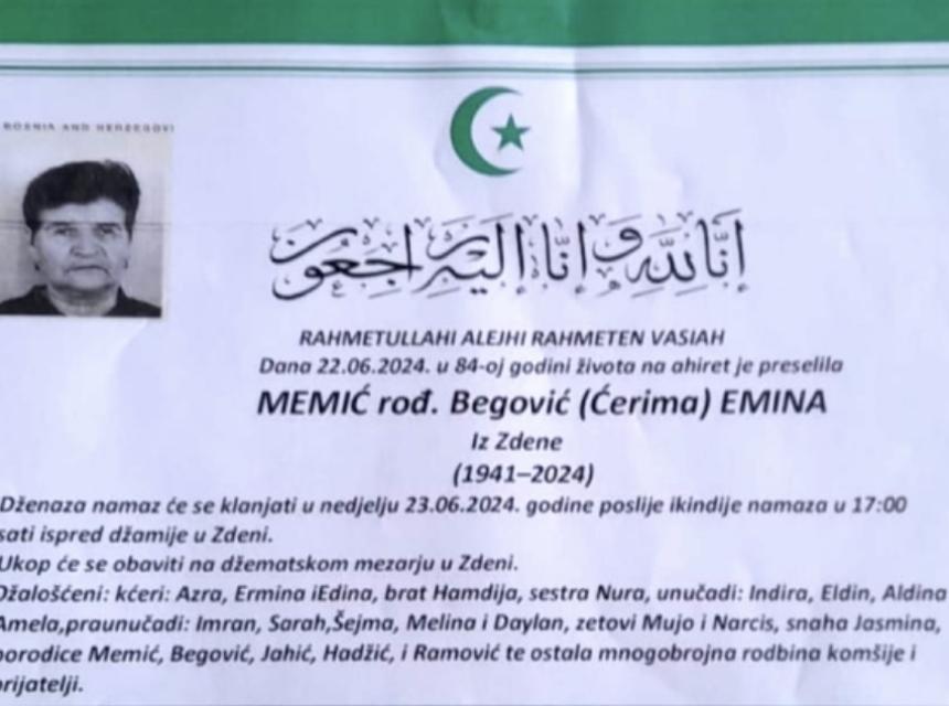 Tužnim srcem i bolom u duši javljamo rodbini, prijateljima i komšijama da je naša draga Memić rođ. Begović (Ćerima) Emina, dana 22.06.2024. godine u 84-oj godini života, preselila na Ahiret.
